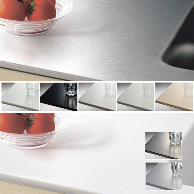3種全17色を品揃えしています。すりガラスのようなTOTO独自開発の「クリスタルカウンター」は、光を纏い優しく輝きます。汚れを放置してもシミになりにくく、簡単なお手入れでキッチンのきれいを保てます。