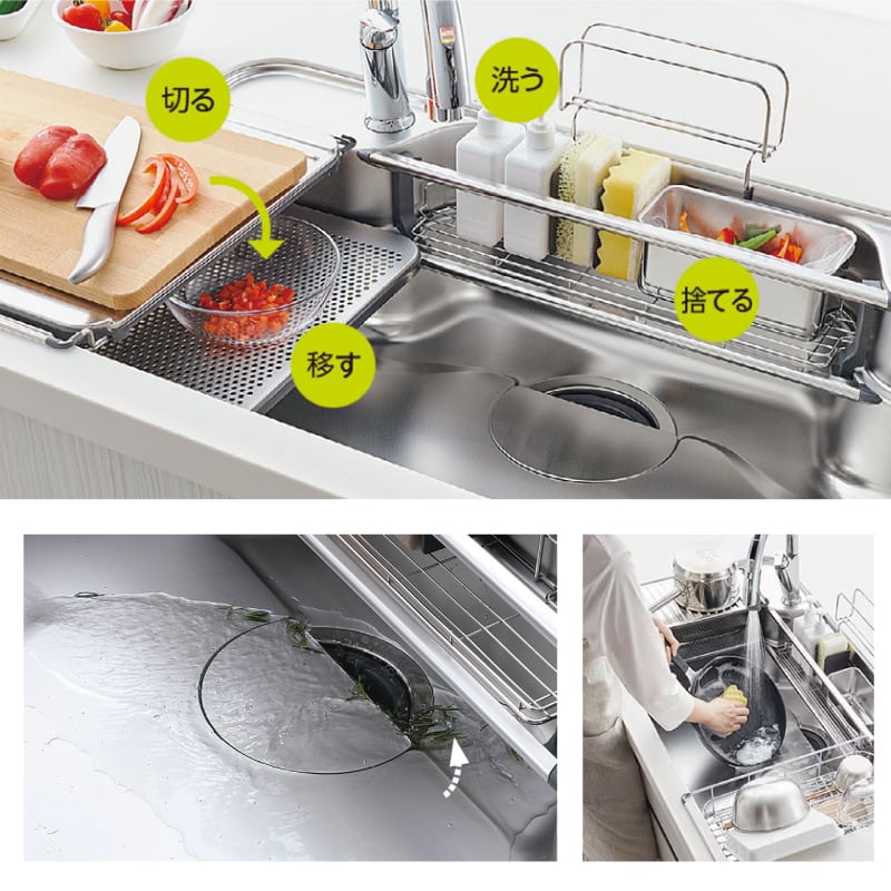 ■フロアユニット:らくパッと収納シェルフ付(シンク下)/スライドストッカー(コンロ下)/スライドストッカー3段引出し(調理台)