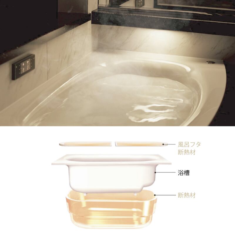■浴槽:マウント浴槽(ワイド)、マウント浴槽(弓形)、マウント浴槽(ナナメ)、腰掛け浴槽・スゴピカ素材(有機ガラス系)(単色・グロス色)(保温浴槽II)・リゾートバブル・浴槽ハンドルなし(1717はあり)、ポップアップ排水栓・断熱組みフタ、組みフタフック(メタル)
