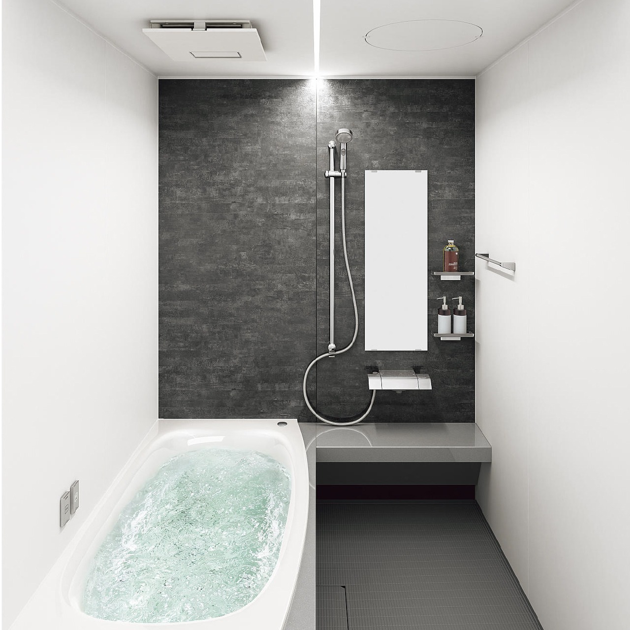 ■洗い場側水栓:メタル水栓(スクエア・ささっとキレイ仕様)・W水流シャワー(メタルワンタッチ)+ハイメタルホース/シャワースライドバー(メタル)